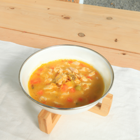 - 雞胸肉、南瓜、胡蘿蔔、鵪鶉蛋、青豆、橄欖油、雞湯